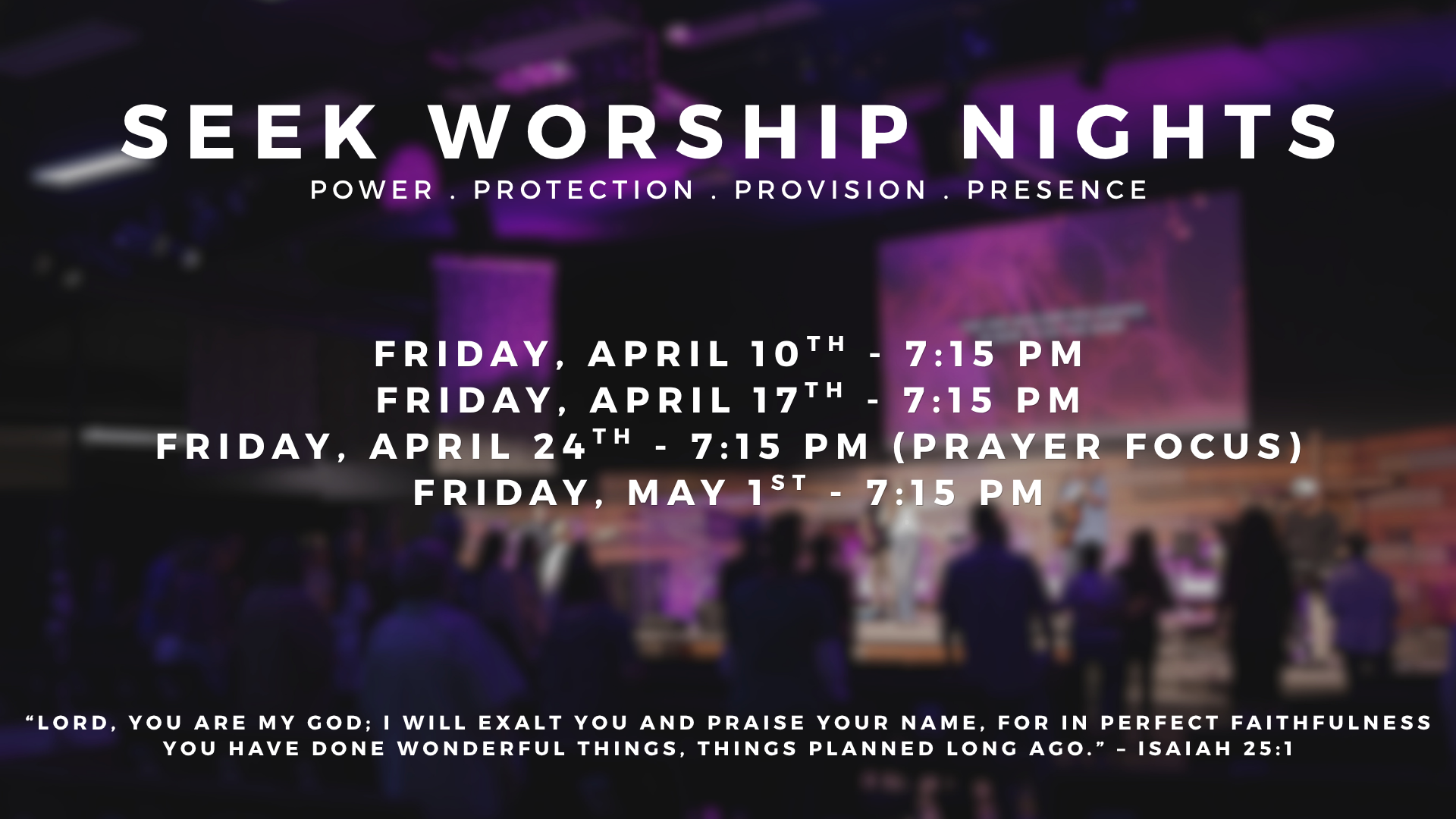 From April 4th-May 1st we are heading into a season of extended prayer and worship to continue with our fast and Seeking God’s power, protection, provision and presence.